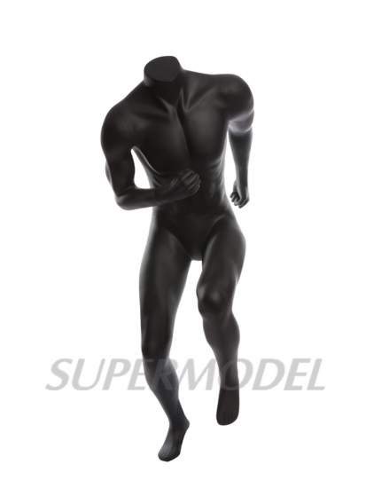 This male headless Sports Running Men Mannequin for Sale in matte black in a running pose.The arms,hands,and leg are removable to make changing outfits easy and quick.Comes with a brushed metal base.